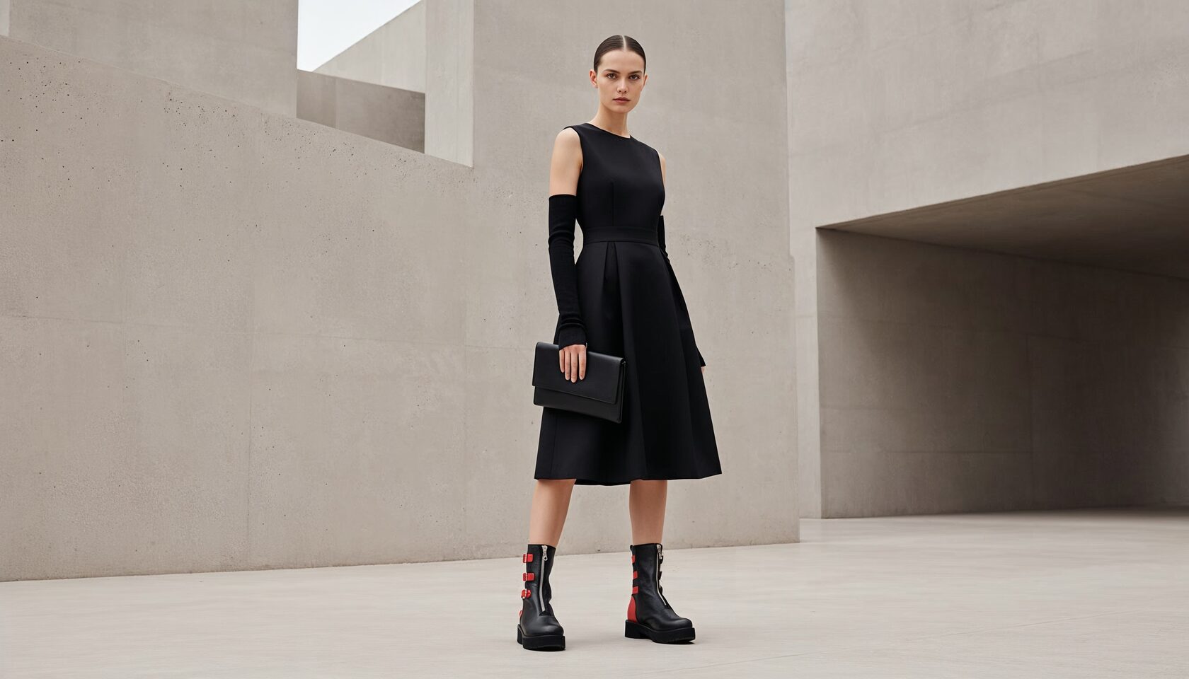 The color palette reflects her character: neutral, timeless shades such as black, grey, beige, cream, white, and red. Colors that do not follow seasons or fleeting trends, but embody a constant sense of refinement—perfect for those who live in international contexts and seek a versatile, cosmopolitan look.